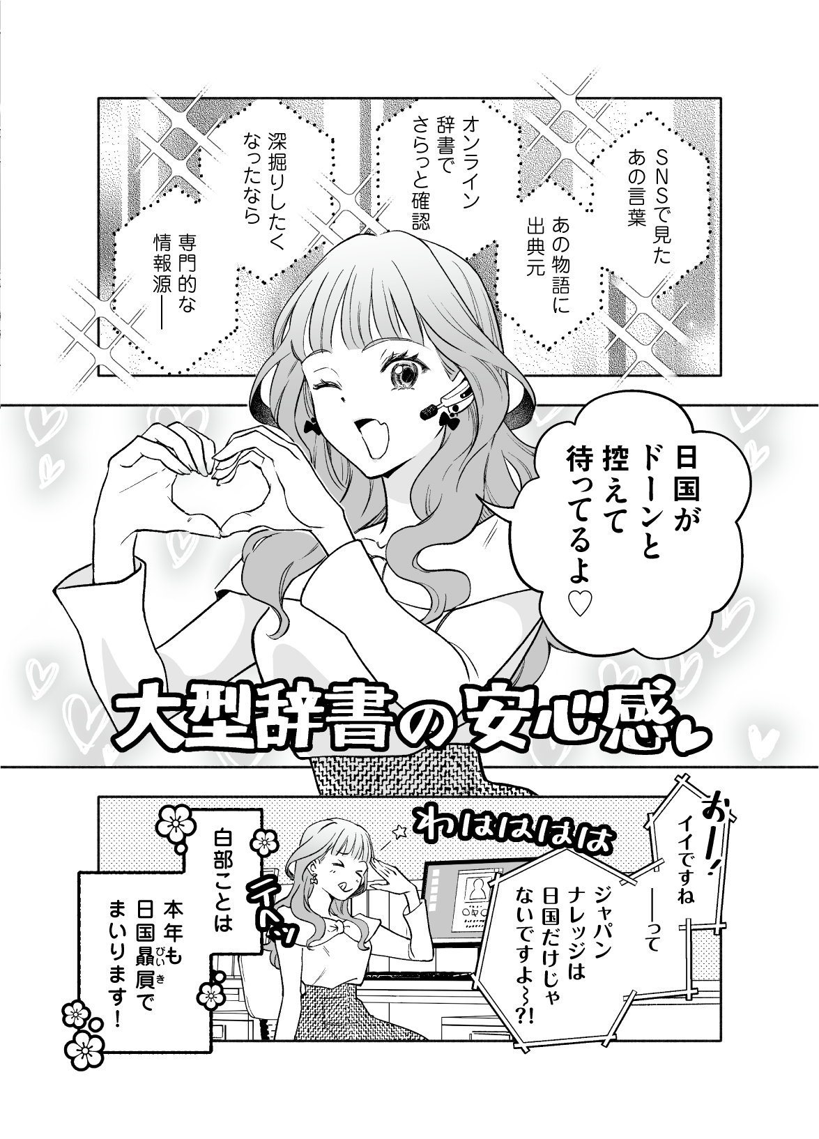 いよいよはじまった日本最大の国語辞典『日本国語大辞典』の大改訂。30年の一度の大プロジェクトに、新人編集者の主人公(白部ことは)が抜擢。意気込みと辞書愛は十分、でも知識と経験はまだまだ? 先輩編集者の助けも借りて、この難事にいどみます! 『日本国語大辞典』の詳細もわかる半実録マンガが登場!!